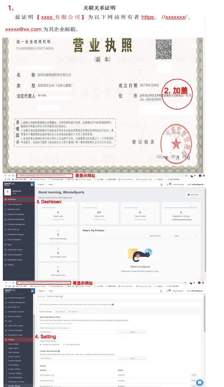 另一方面,您的SHOPLINE独立站后台截图需完整显示网站域名、店铺名称,而且最好是英文页面。