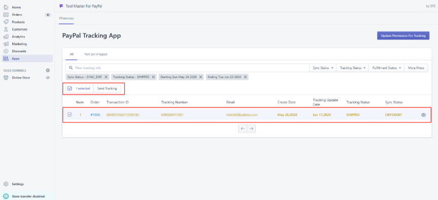 在订单列表中勾选您需要将物流信息同步⾄ PayPal 的订单,并点击 Send Tracking 按钮,系统会⾃动把相关的运单信息发送到 PayPal 服务器,稍后也会在您的订单列表中标记出哪些订单已同步。