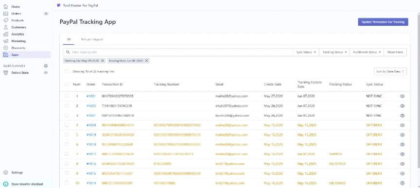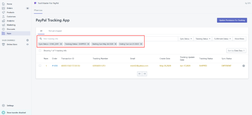Tool Master For PayPal拥有出色的精准过滤功能,它提供了5种过滤条件,商家可以通过查询输入框、同步状态(Sync Status)、订单发货状态(Fulfillment Status)、运货单状态(Tracking Status)、订单创建时间进行订单筛选。通过这5种过滤条件,商家能及时对相关属性、运单信息、订单状态进行筛查,快速且精准地查询到目标订单,有效节约时间成本。