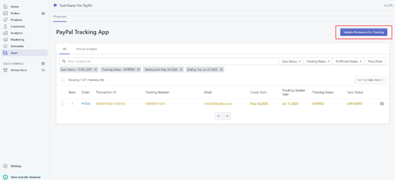 在订单列表的右上方,有一个“Update Permission For Tracking”按钮,点击该按钮会打开新的页面,跳转至 PayPal 的授权页面。请使⽤您已在Shopify商店绑定的PayPal账号完成登录并授权。