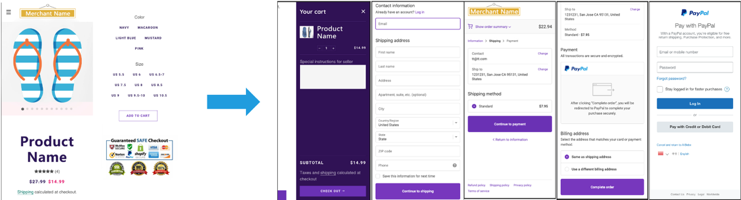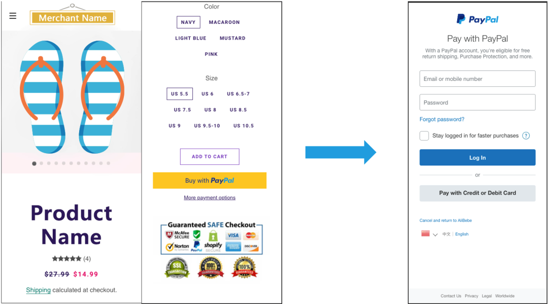 升级Shopify网站的结账方式至PayPal ECS (PayPal Checkout Shortcut Flow) 后,您的顾客可以直接从产品页面或购物车完成购物交易,付款流程被大大简化。同时,顾客在购买时,无需再次填写收货地址,直接读取常用的PayPal 收货地址,就可以更加便捷地完成购物。根据2020年第2季度的商家调研显示「2」,将Shopify网站的结账方式升级为“PayPal Checkout Shortcut Flow”,支付按钮的点击得到了20%-35%的提升。