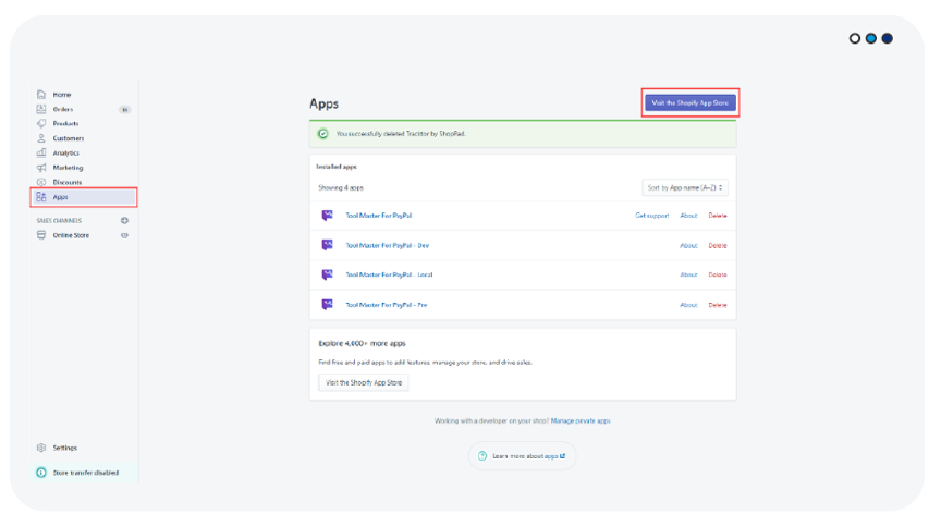 确认您的Shopify店铺后台需要是已登录的状态,在后台的左侧菜单中选择Apps之后点击右侧的访问Shopify应用商店按钮(Visit the Shopify App Store),或直接登录Shopify应用商店(Shopify App Store)。在Shopify应用商店的搜索框中输⼊Tool Master For PayPal,即可找到此款应用。