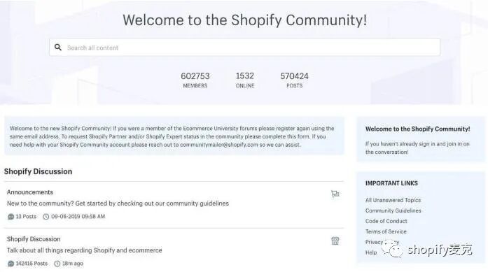 Community forums就可以进入到shopify的英文论坛,可以和来自全球的卖家在线沟通交流。
